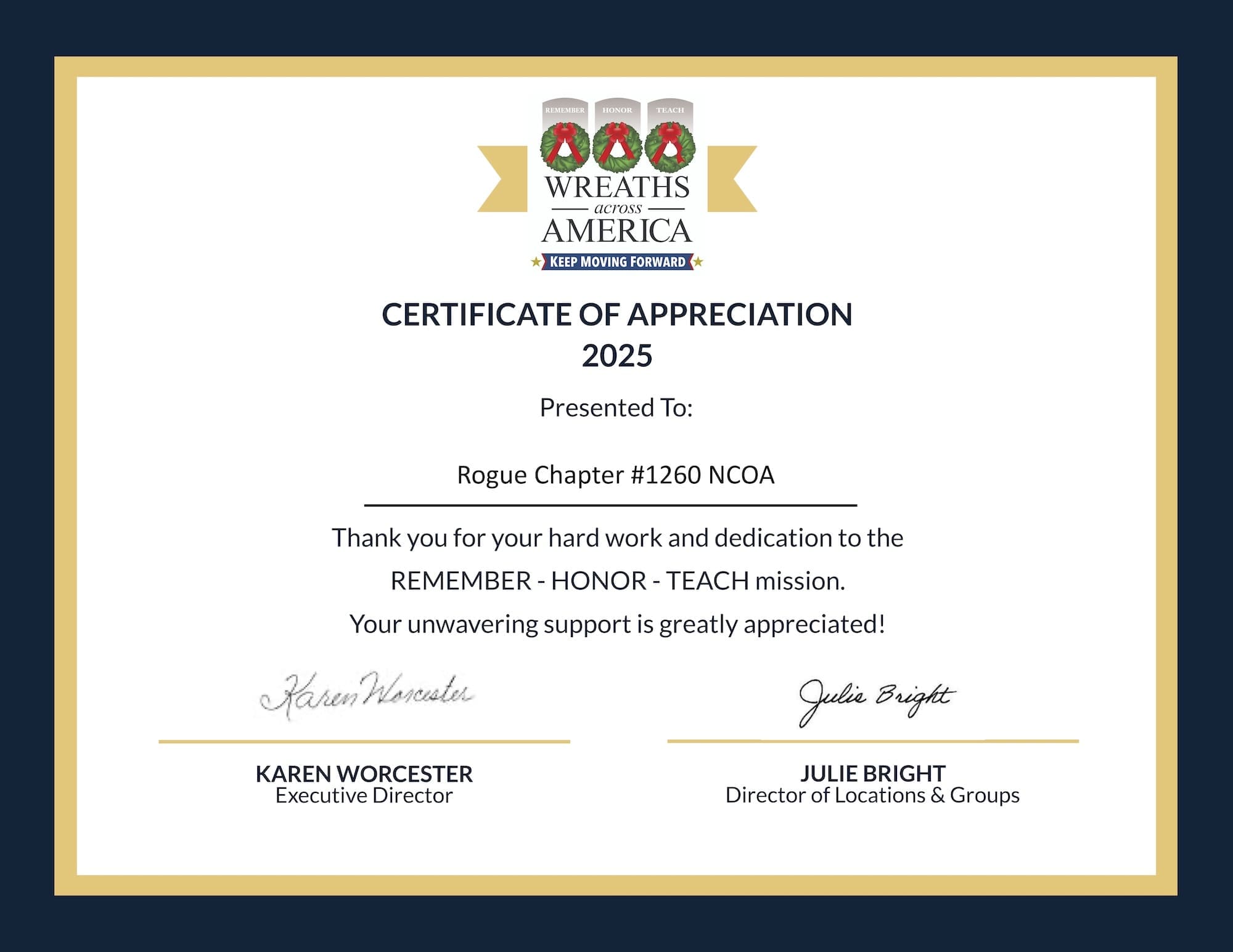 Last month several members came out and helped pick up the almost 3,500 wreaths placed at the Eagle Point National Cemetery. It is our intention to participate in this program again this year and with a little luck we will be able to surpass our efforts in 2025.